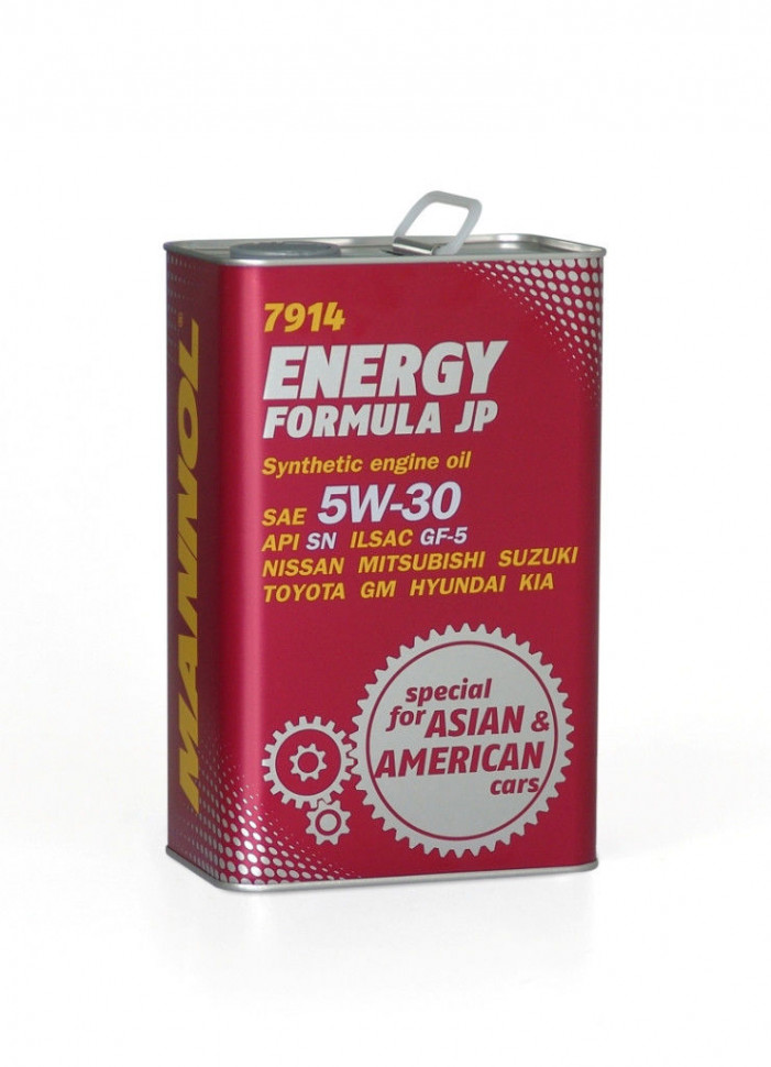 MANNOL Energy Formula JP - универсальное моторное масло предназначенное для двигателей японских, корейских и американских легковых автомобилей, минивэнов, внедорожников, SUV и микроавтобусов. Разработано специально для двигателей с системами непосредственного впрыска (GDI, D-4D, NEO-DI), с турбонаддувом, а также с различными механизмами изменения фаз газораспределения (DOHC, VVT-i, VTC, CVVT, VTEC, VVL, VVTL-i, MIVEC и др.). Обладает высокими антиокислительными свойствами и превосходными моюще-диспергирующими характеристиками, что предупреждает образование отложений на деталях двигателя.Спецификация API SN; GF-6A